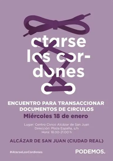 Podemos celebrará su próxima asamblea ciudadana estatal el próximo 11 y 12 de febrero. Según se informa en un comunicado de prensa, “y en relación a este evento, nos encontramos en el período de transacción de documentos elaborados por los "círculos" de nuestra región, y en la ruta "Atarse los cordones" hemos organizado un encuentro de carácter regional”, este encuentro se va a celebrar en Alcázar de San Juan este 18 de enero a las 6 de la tarde en el Centro Cívico.