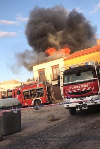 Varios camiones de bomberos y efectivos de la policía local han tenido que acudir esta tarde a la plaza de la Bolsa de Alcázar de San Juan para sofocar un aparatoso incendio producido en el interior de una vivienda (concretamente en el número 15). Como puede verse en la fotografía, las llamas que salían desde el interior han acabado con gran parte de la cubierta y estructura del edificio, afectando a todo el vecindario