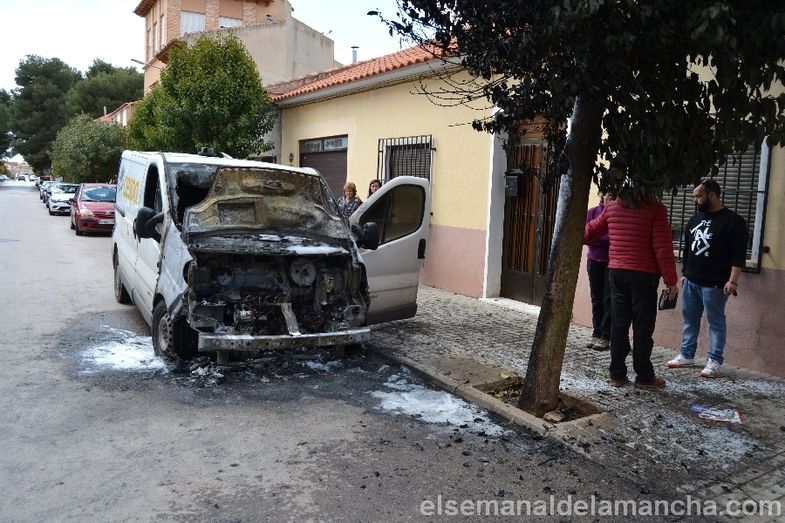 Efectivos del Cuerpo de Bomberos y Policía Nacional han intervenido esta mañana en el incendio de una furgoneta aparcada junto al número 31 de la calle Barataria en Alcázar de San Juan, donde ha tenido que ser cortado el tráfico hasta que se han sofocado las llamas.