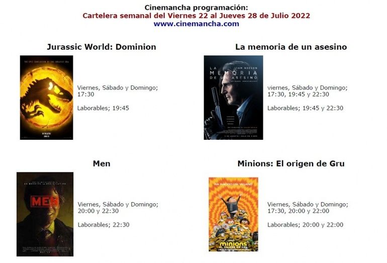 CARTELERA CINEMANCHA El Semanal 22 de julio de 2022 (15:15 h.) Del viernes 22 al jueves 28 de julio Leer más Relacionados CARTELERA CINEMANCHA