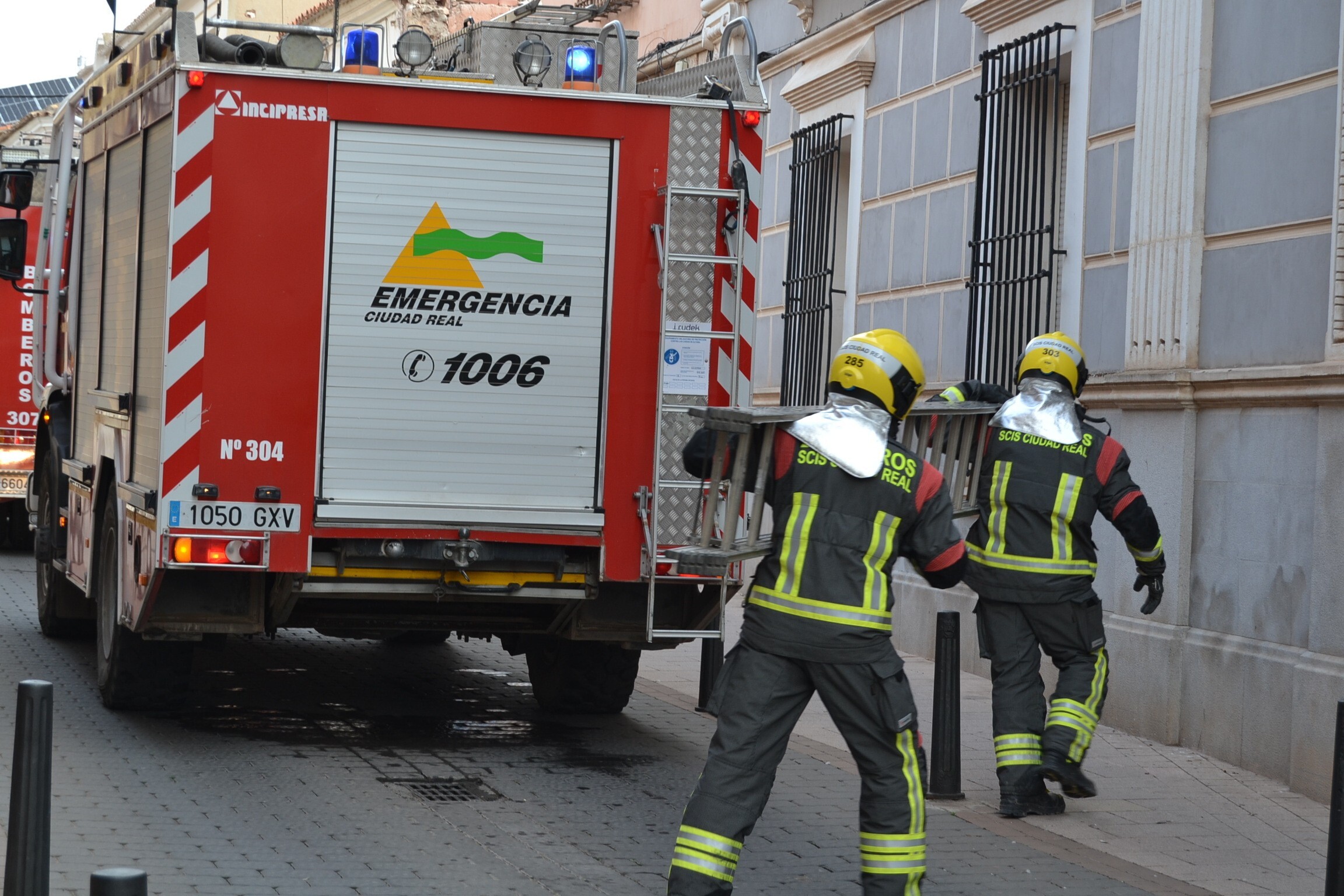 Efectivos del parque de bomberos de Alcázar de San Juan y policía local han acudido esta mañana a la calle Canalejas para auxiliar a los propietarios de una vivienda en la que se había acumulado gran cantidad de humo (enfrente de CCOO).