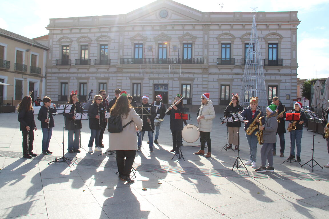 Componentes de la Banda de Educandos y de la Banda titular de la Asociación Musical Santa Cecilia de Alcázar de San Juan se han dado cita este sábado en la plaza de España para dar la bienvenida a la Navidad. Vestidos con gorros y complementos festivos, han ofrecido un repertorio navideño al aire libre que ha sido seguido con atención por numerosos vecinos y vecinas que paseaban o realizaban compras en el centro de la ciudad.