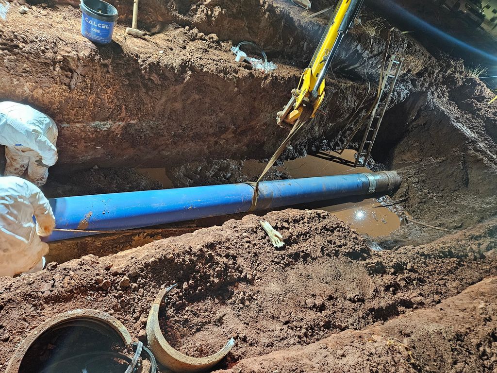 Sobre las 23:30h de la noche, se pudo visualizar que se trataba del reventón de un tubo de fibrocemento existente, ya entre un tramo de fundición procedente de arreglos anteriores y otro tramo de fibrocemento antiguo. La reparación ha consistido en la sustitución del tubo dañado de 400mm de diámetro y 6 metros de longitud, por uno nuevo de fundición dúctil de las mismas dimensiones, conectado por sus extremos con sendas uniones ARPOL al resto de la canalización.