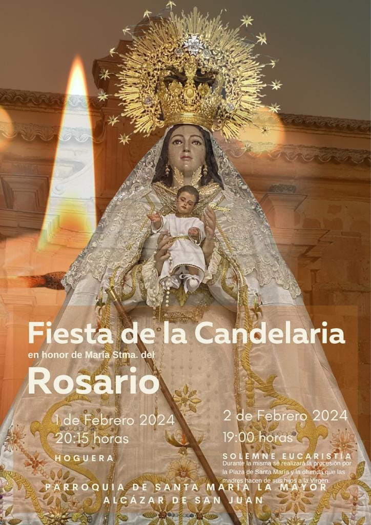 La Parroquia de Santa María La Mayor acogerá este viernes, 2 de febrero, el acto principal de las Fiestas de la Candelaria, que en Alcázar se celebran en honor de María Santísima del Rosario, Patrona y Alcaldesa Perpetua de la ciudad. Un día en el que se conmemora la presentación de Jesús en el Templo y que la iglesia católica dedica a la luz, a las madres y a sus hijos menores.