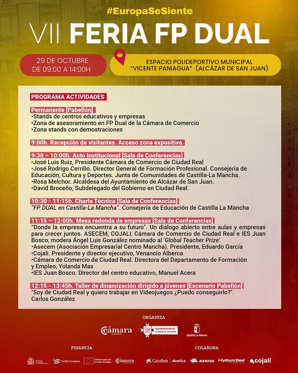 La feria contará, además, con actividades paralelas como una ponencia sobre la nueva Ley de FP Dual a cargo del director general de Formación Profesional, José Rodrigo Cerrillo, una mesa redonda empresarial bajo el título “Donde la empresa encuentra su futuro”, y un taller juvenil centrado en las oportunidades laborales en el sector de los videojuegos.