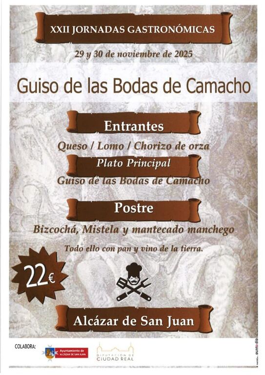 Este sábado 29 y domingo 30 de noviembre, Alcázar de San Juan se viste de mantel y tradición para acoger una nueva edición de las Jornadas del Guiso de las Bodas de Camacho. Un acontecimiento gastronómico y cultural consolidado que reúne a una veintena de restaurantes de la ciudad, todos ellos dispuestos a servir el menú tradicional con el que cada año se revive una receta legendaria de la Mancha.