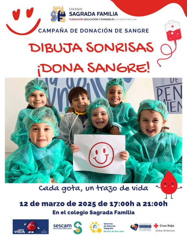 Los alumnos y alumnas de 3, 4 y 5 años del colegio Sagrada Familia de Alcázar de San Juan han impulsado una campaña de donación de sangre con el le,a "Dibuja sonrisas, dona sangre". Estos pequeños han asumido, una vez más, un papel protagonista en esta iniciativa solidaria dentro de su proyecto de Aprendizaje-Servicio (APS), con el objetivo de concienciar a la comunidad sobre la importancia de donar sangre.