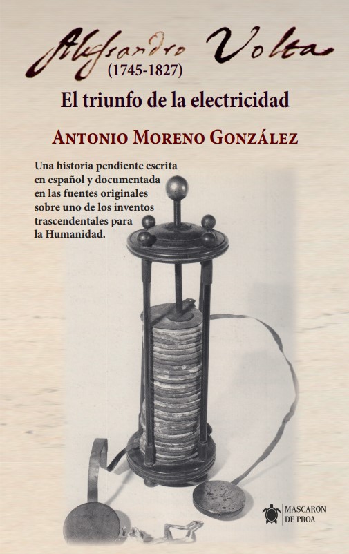 El profesor catedrático alcazareño Antonio Moreno González, maestro de maestros y doctor en Ciencias Físicas, presentará próximamente su nuevo libro "Alessandro Volta (1745-1827). El triunfo de la electricidad", editado por Mascarón de Proa y ya a la venta en plataformas digitales. "Una historia pendiente escrita en español y documentada en las fuentes originales sobre uno de los inventos trascendentales para la Humanidad", según señala el propio editor en la portada.