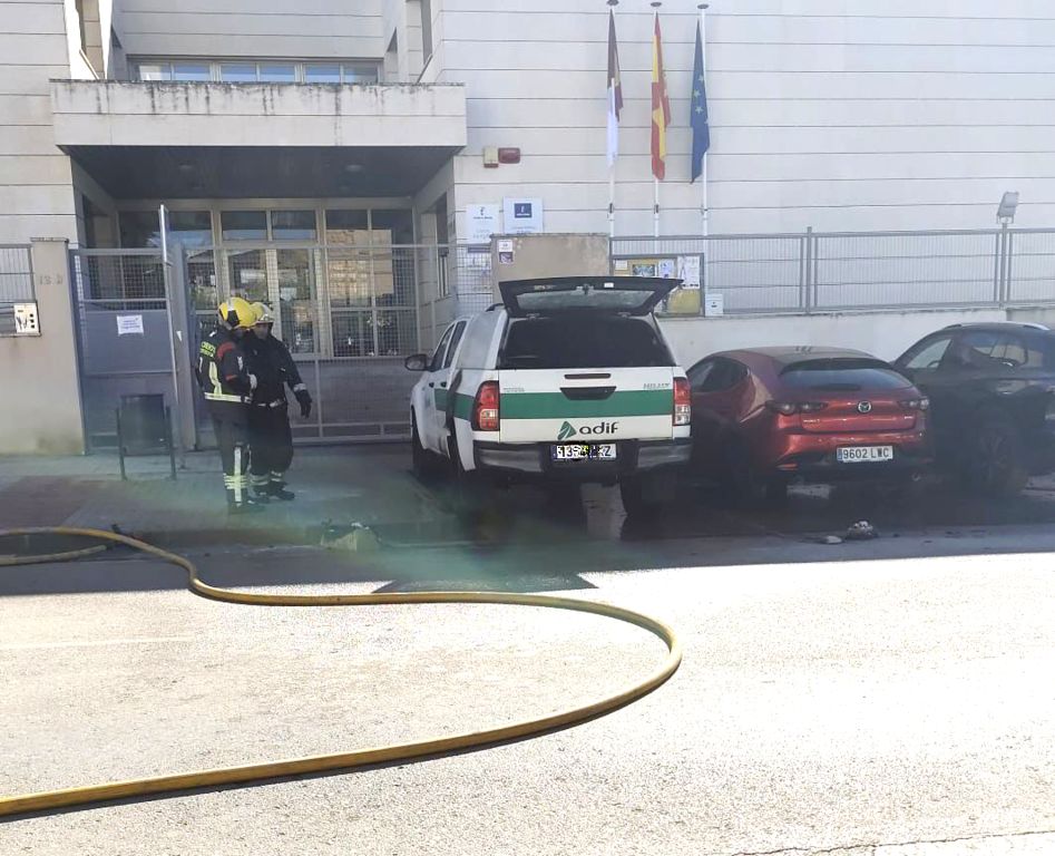Un vehículo, propiedad de Adif, ha salido ardiendo este lunes mientras estaba aparcado en la puerta del colegio El Santo de Alcázar de San Juan.