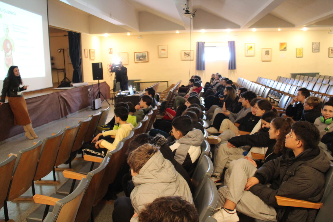 Carolina Castillejos, psicóloga de la Asociación Española Contra el Cáncer, ha sido la encargada de impartir esta charla y de compartir con el alumnado los beneficios de adoptar hábitos saludables e integrarlos en sus vidas, buscando "fomentar un pensamiento crítico en los adolescentes y que ellos aprendan a valorar realmente lo que quieren meter en su cuerpo".