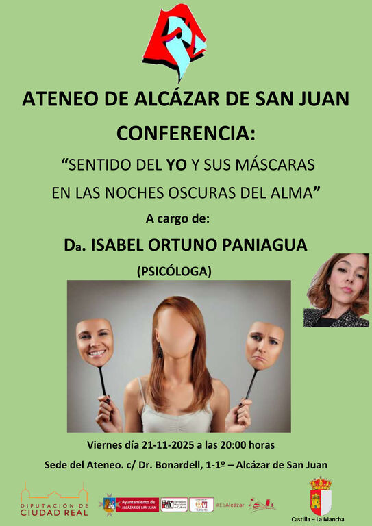 Este viernes 21 y a las 20:00 horas, tendrá lugar, en el salón de usos múltiples del Ateneo de Alcázar de San Juan, la conferencia “Sentido del yo y sus máscaras en las noches oscuras del alma”, dentro del ciclo “Las conferencias de los viernes”, a cargo de la psicóloga Isabel Ortuno Paniagua.