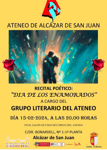 Para conmemorar el 14 de febrero, día del amor, el Grupo Literario del Ateneo ofrecerá el Recital Poético “Día de los Enamorados”, en el que sus componentes recitarán poemas de diversos autores, elegidos por ellos mismos, donde el común denominador es el amor.