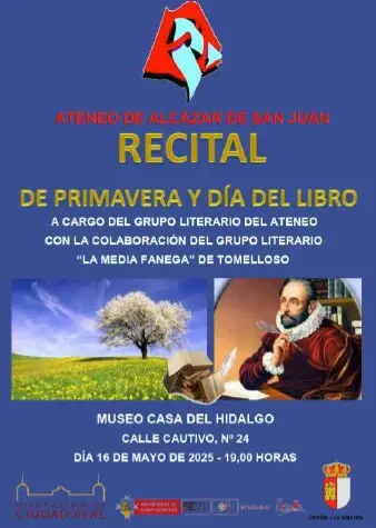 Este viernes, día 16 de mayo, en la Casa del Hidalgo de Alcázar de San Juan, tendrá lugar, a partir de las 19 horas, un acto de lectura de poemas relacionados con la estación en la que estamos inmersos, La Primavera, haciendo alusión al pasado Día del Libro.