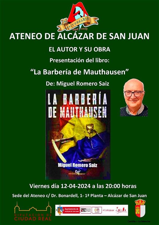 Este viernes día 12 de abril, el Ateneo de Alcázar de San Juan cuenta con la presencia de Miguel Romero Saiz, quien regresa al Ateneo para presentar su nueva obra, una novela histórica: “La Barbería de Mauthausen”.