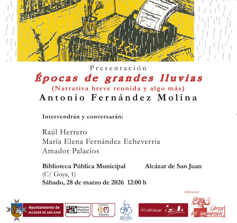La Biblioteca Pública Municipal Miguel de Cervantes de Alcázar de San Juan acogerá este sábado, 28 de marzo, a las 12:00 horas, la presentación del libro Épocas de grandes lluvias (Narrativa breve reunida y algo más), una obra que recupera la narrativa breve del escritor alcazareño Antonio Fernández Molina.