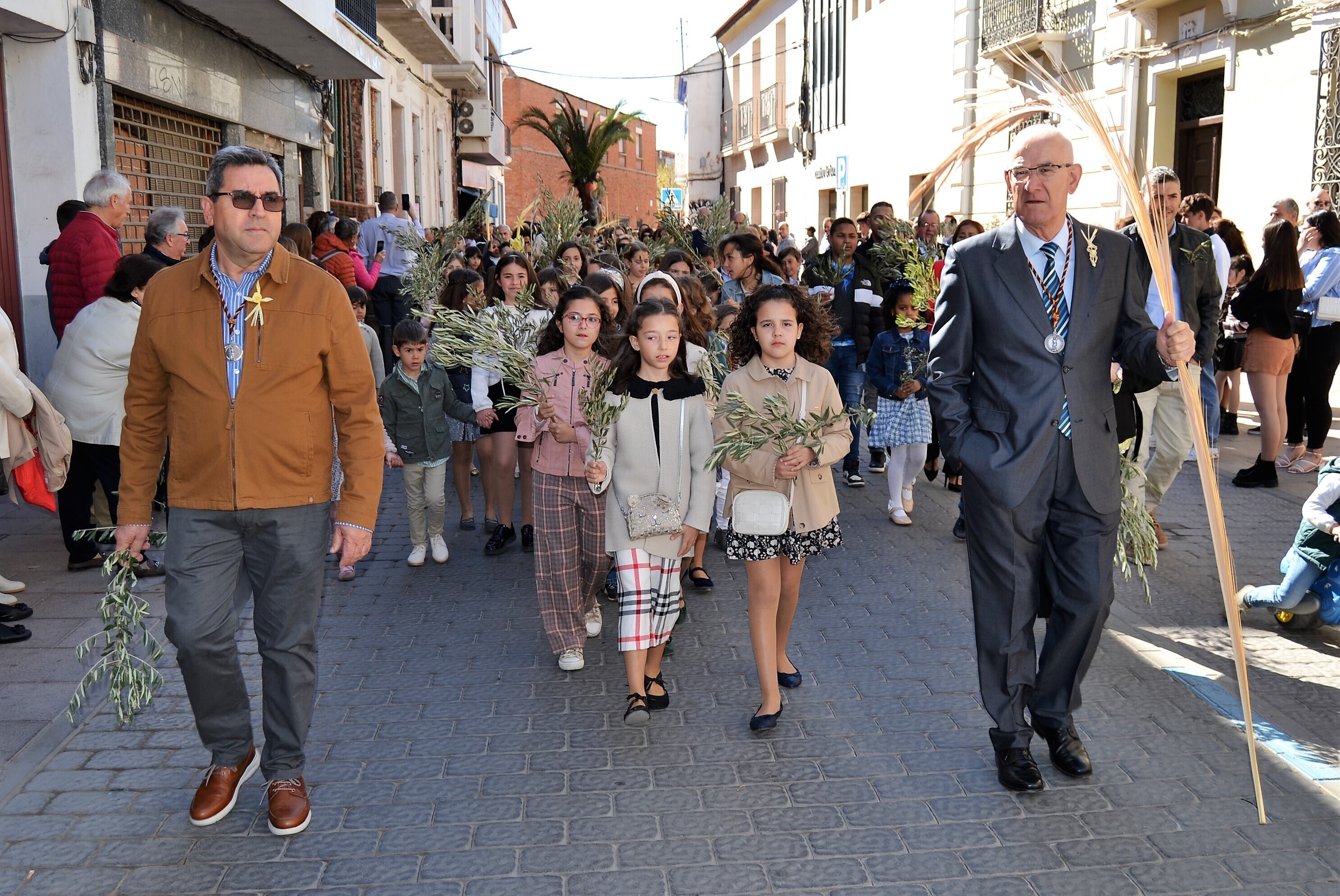 Con algo de viento y abundante sol, abriendo la procesión, la banda de Jesús del Perdón, seguida de numerosos niños y niñas de todas las parroquias, ataviados en algunos casos como hebreos y con ramas de olivo en sus manos. Delante de la imagen de Jesús a lomos de la borriquilla, también numerosos padres y madres con sus hijos; y detrás, cerrando el desfile sacerdotes, autoridades, miembros de la Junta General de Cofradías y representantes de las distintas hermandades y devotos.