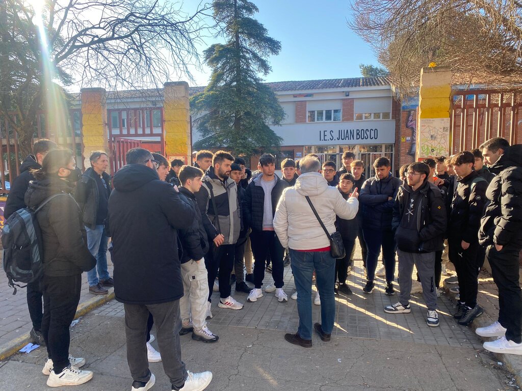 Hartos de las averías en la calefacción, de las goteras cuando llueve y del mal estado en general de la zona de talleres, alumnos de Formación Profesional del IES Juan Bosco de Alcázar de San Juan se han concentrado esta mañana para exigir que se ponga fin a la situación que viene padeciendo este centro desde hace años, pendientes desde hace más de una década del proyecto de reforma del instituto y concretamente de la construcción de un nuevo edificio o espacio para los talleres.
