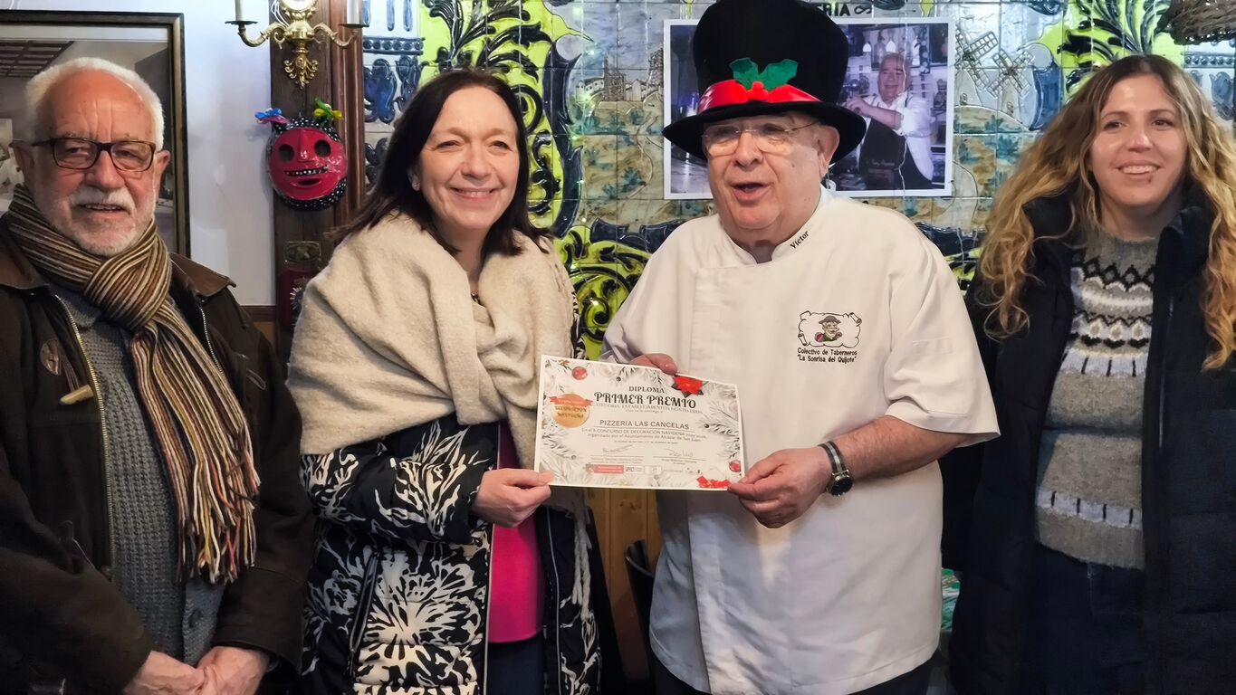 El emblemático establecimiento Pizzería Las Cancelas, del conocido tabernero Víctor García Chocano, ha sido galardonado con el primer premio en la categoría de establecimientos hosteleros del X Concurso de Decoración Navideña convocado por la Concejalía de Ocio, Turismo y Comercio de Alcázar de San Juan.