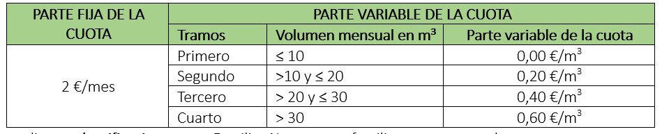 La cuota tiene una parte fija de dos euros (2 €) por vivienda y mes; y una parte variable por tramos que se empezará a pagar a partir de un consumo de 10 m3 al mes: