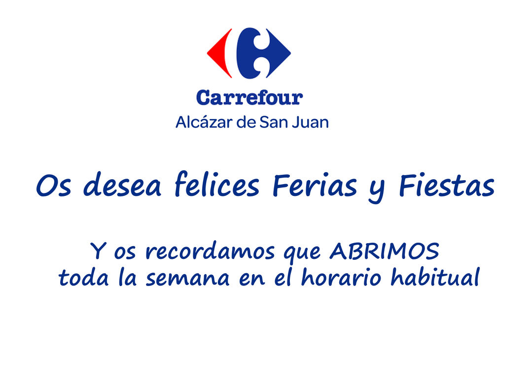 Carrefour Alcázar de San Juan les desea felices Ferias y Fiestas 2024; y les recuerda que permanecerá abierto todos los días de Feria en el horario habitual