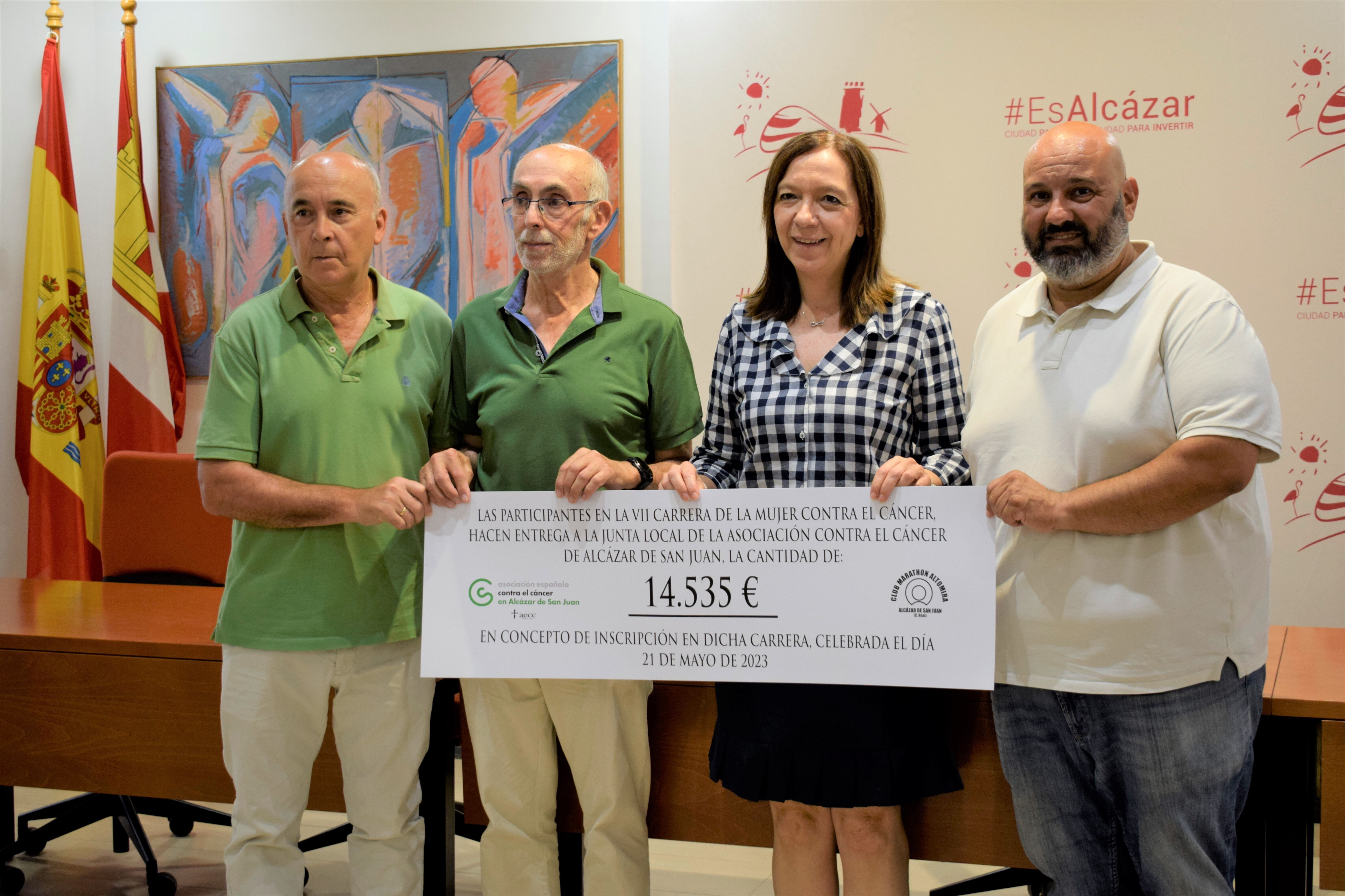 La VII edición de la Carrera de la Mujer de Alcázar de San Juan ha conseguido recaudar, tras quitar los gastos del evento, un total de 14.535 euros, que, en un cheque simbólico, han sido entregados este jueves por parte de la alcaldesa de Alcázar, Rosa Melchor, al presidente de la junta local de la Asociación Española contra el Cáncer, Enrique Lubián.