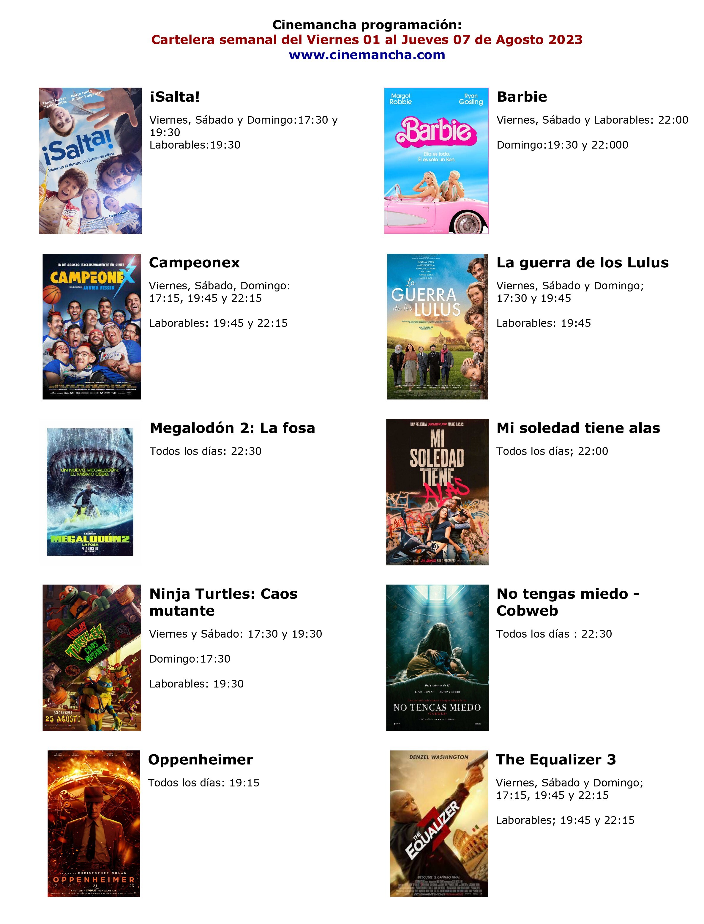 Cartelera de Multicines Cinemancha del viernes 1 al jueves 7 de septiembre