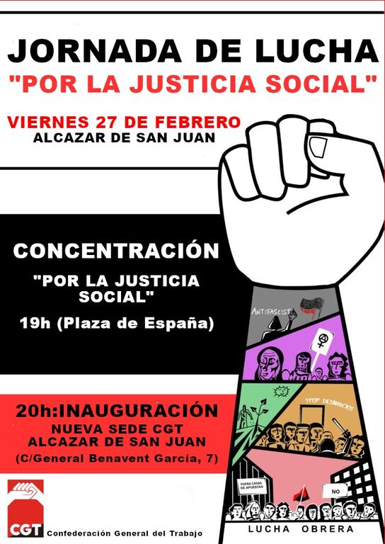 La Confederación General del Trabajo (CGT) ha convocado en Alcázar de San Juan una jornada de movilización “por la justicia social” que se celebrará el viernes 27 de febrero y que combinará una concentración en la vía pública con la inauguración de su nueva sede en la localidad.