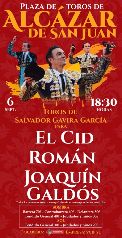 La Plaza de Toros de Alcázar de San Juan se vestirá de gala el próximo sábado 6 de septiembre a las 18:30 horas con motivo de la tradicional Gran Corrida de Toros de Feria y Fiestas. En esta ocasión, se lidiarán seis ejemplares de la prestigiosa ganadería de Salvador Gavira García, reuniendo el cartel a tres destacados matadores acompañados de sus correspondientes cuadrillas: Manuel Jesús “El Cid”, Román y Joaquín Galdós.