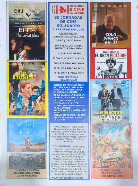 Las Jornadas de Cine Solidario de Alcázar de San Juan celebran su 30ª edición consolidándose como una de las citas más longevas y comprometidas con la cooperación internacional en la comarca. Tres décadas en las que se han proyectado más de 150 películas para sensibilizar al público sobre realidades sociales de todo el mundo, recaudando fondos con los que se han financiado 102 proyectos en países en desarrollo gracias a la implicación de ONGs, colectivos y espectadores.
