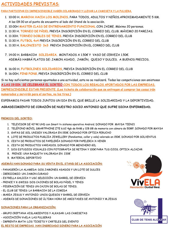 El Club de Tenis de Alcázar de San Juan albergará mañana, sábado 8 de junio, una jornada deportiva solidaria repleta de actividades, rifas, sorteos, juegos y por supuesto, deporte, con la intención de recaudar fondos a beneficio de la asociación "Vivela", para los enfermos de ELA.