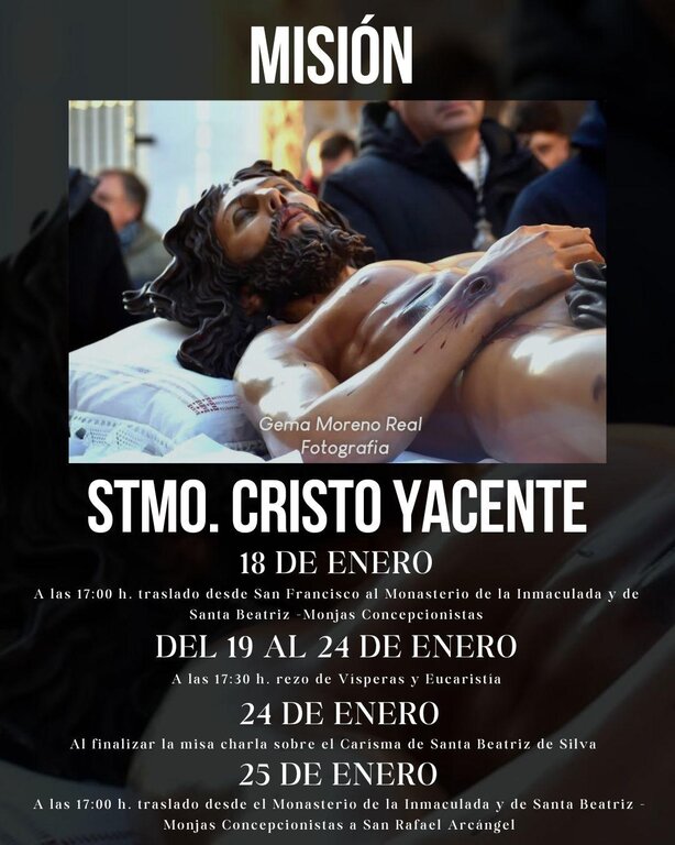 La Cofradía del Santo Entierro se encuentra inmersa en la denominada “Misión del Yacente”, dentro de los actos del 75 Aniversario de su refundación. Esta Misión consiste en llegar con la imagen de su Titular, el Santísimo Cristo Yacente, a toda la ciudad de Alcázar de San Juan, por lo que están visitando parroquias, iglesias conventuales y residencias donde terminarán dicha misión en Alameda de Cervera mediante un Viacrucis.