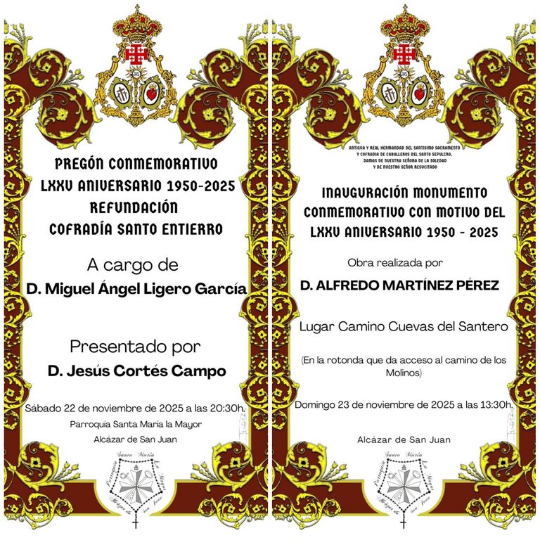 El sábado 22 de noviembre, a las 20:30 horas, la Parroquia de Santa María acogerá el pregón conmemorativo del aniversario. El acto estará presentado por Jesús Cortes Campo, antiguo secretario de la Cofradía y estrechamente vinculado tanto a la Hermandad como a la vida parroquial. El pregón correrá a cargo de Miguel Ángel Ligero García, también hermano de la Cofradía y costalero en numerosas hermandades de Alcázar, cuya intervención se espera especialmente emotiva.