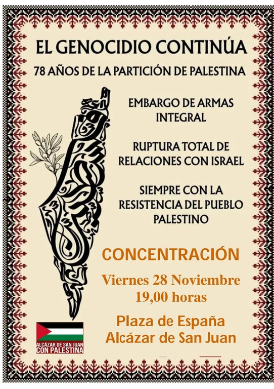 La Plataforma en Defensa de Palestina ha convocado para el próximo viernes 28 de noviembre, a las 19:00 horas, una concentración en la Plaza de España de Alcázar de San Juan. La cita se difunde bajo el lema principal "El genocidio continúa — 78 años de la partición de Palestina".