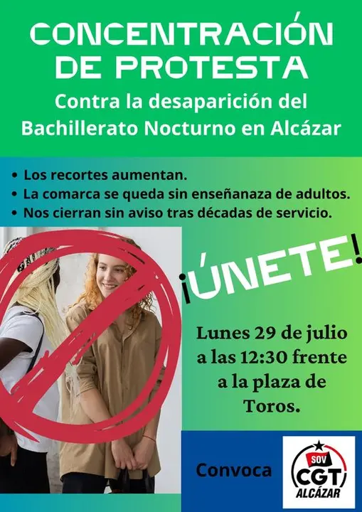 El Sindicato de Oficios Varios CGT Alcázar ha convocado el lunes, 29 de julio, una concentración para protestar contra diversos recortes educativos, especialmente contra la decisión de cerrar el bachillerato nocturno que durante décadas venía impartiéndose en el IES Miguel de Cervantes de esta localidad. Modalidad que permitía que muchos alumnos y alumnas con problemas de conciliación pudieran asistir a clase y titular.