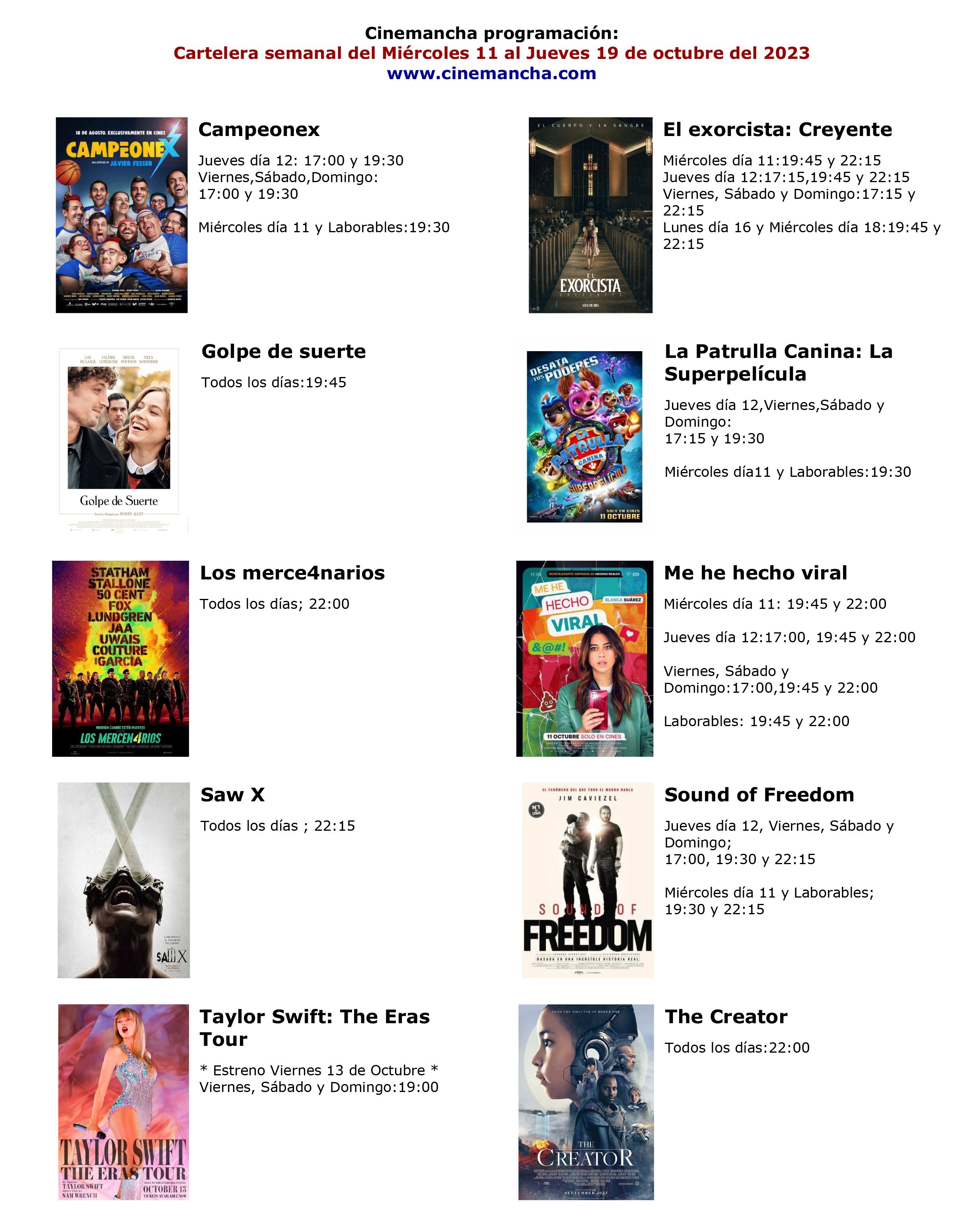 CARTELERA SEMANAL CINEMANCHA, DEL MIÉRCOLES 11 AL JUEVES 19 DE OCTUBRE DE 2023