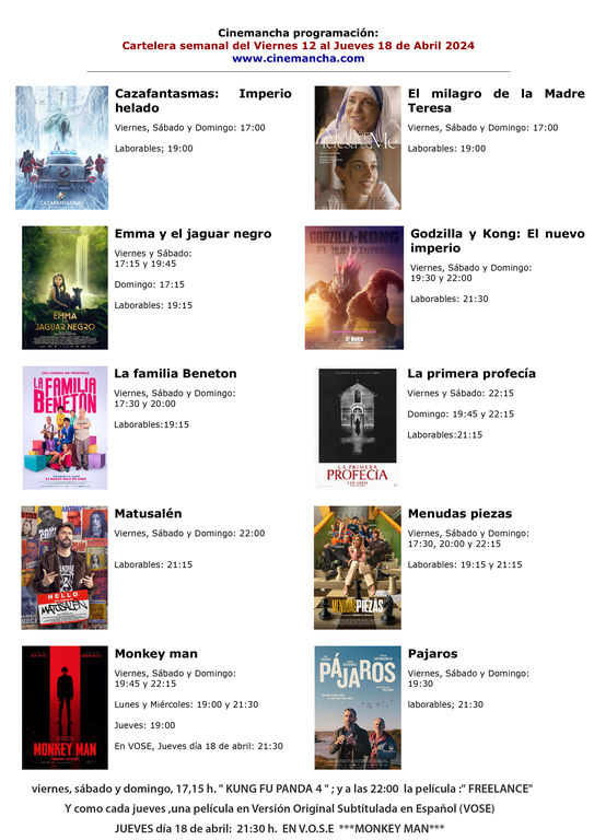 CARTELERA CINEMANCHA DEL VIERNES 12 AL JUEVES 18 DE ABRIL DE 2024