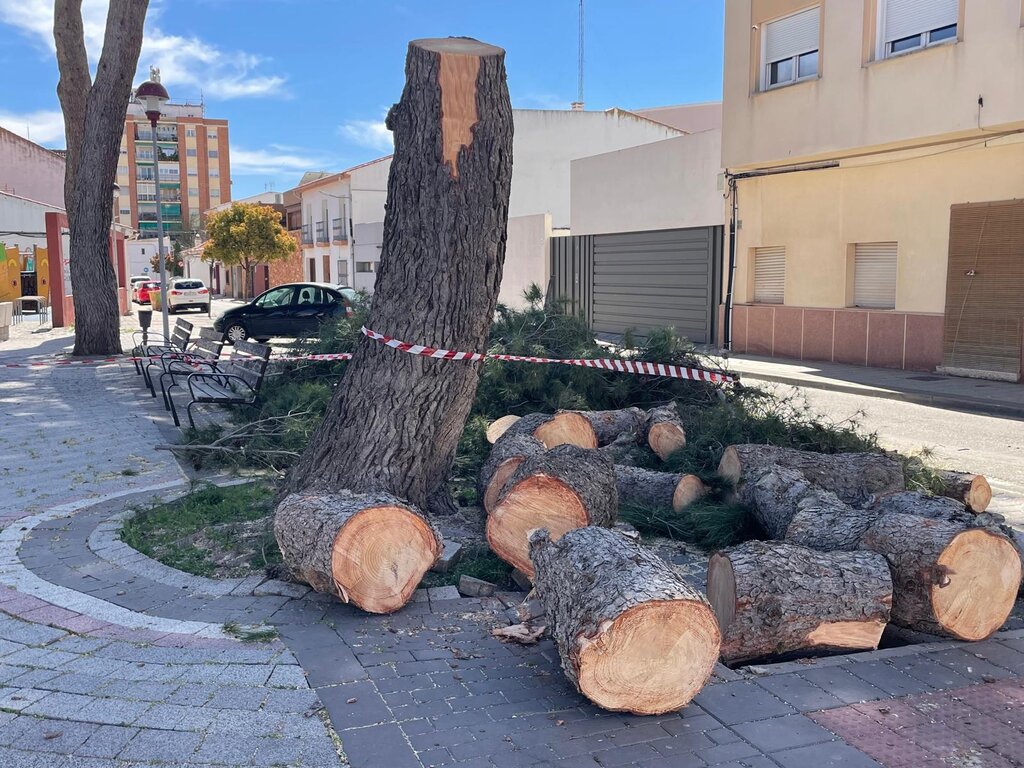 Los trabajos de actuación sobre "los pinillos" de la plaza Barataria han continuado durante este jueves, con labores de talado y poda desde primera hora de la mañana. Según puede verse en las fotografías, la zona ha sido parcialmente acordonada mientras los operarios municipales han estado trabajando en la retirada de ramas y saneamiento de los árboles.