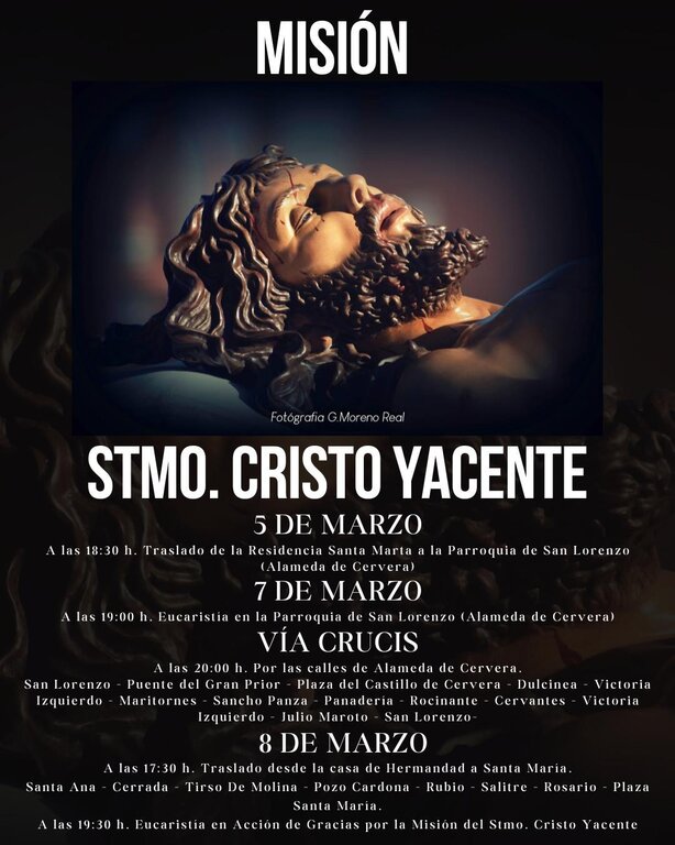 La imagen del Santísimo Cristo Yacente, titular de la Cofradía del Santo Entierro de Alcázar de San Juan, será trasladada este jueves, 5 de marzo, hasta la parroquia de San Lorenzo de Alameda de Cervera, en el marco de la iniciativa denominada “La Misión del Yacente”, organizada con motivo del 75 aniversario de la refundación de la cofradía.