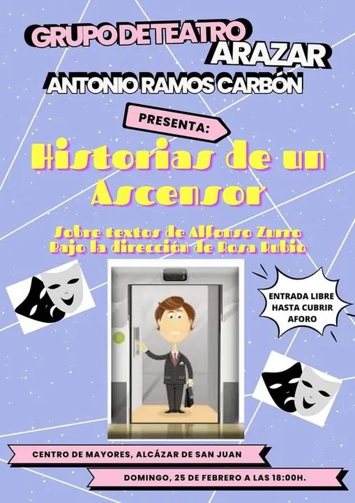 El Centro de Mayores de Alcázar de San Juan acogerá este domingo, día 25 de febrero, a partir de las 18 horas, la puesta en escena de la obra "Historias de un ascensor", a cargo del grupo de teatro ARAZAR Antonio Ramos Carbón. Una obra basada en textos de Alfonso Zurro y dirigida por Rosa Rubio. La entrada es gratuita, hasta completar aforo.