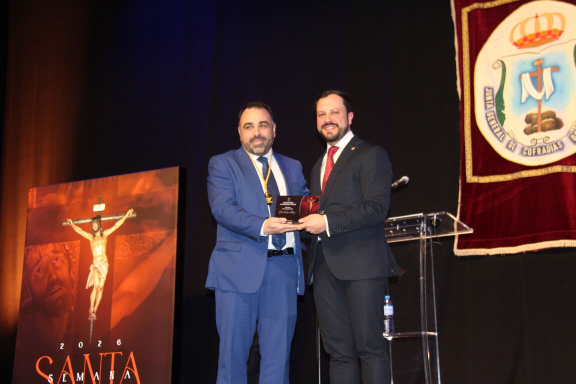El alcazareño Eduardo García Villajos pronunció anoche el pregón de la Semana Santa 2026, en un acto que reunió a representantes de todas las hermandades y cofradías de la ciudad integradas en la Junta General de Cofradías y Hermandades, con su presidente, Carlos Ortiz, al frente, además de autoridades municipales y numeroso público.