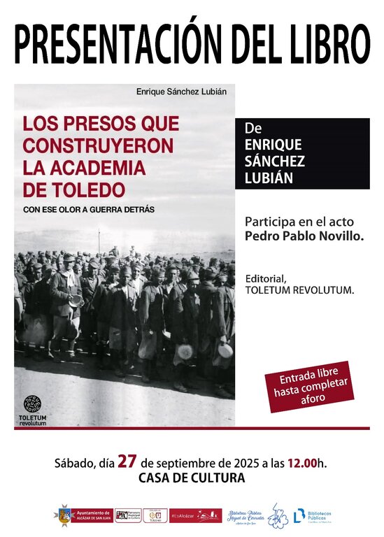 La Casa de la Cultura de Alcázar de San Juan acogerá este sábado, 27 de septiembre, a las 12:00 horas, la presentación del último libro del periodista e investigador Enrique Sánchez Lubián, titulado “Los presos que construyeron la Academia de Toledo”, editado por Toletum Revolutum.