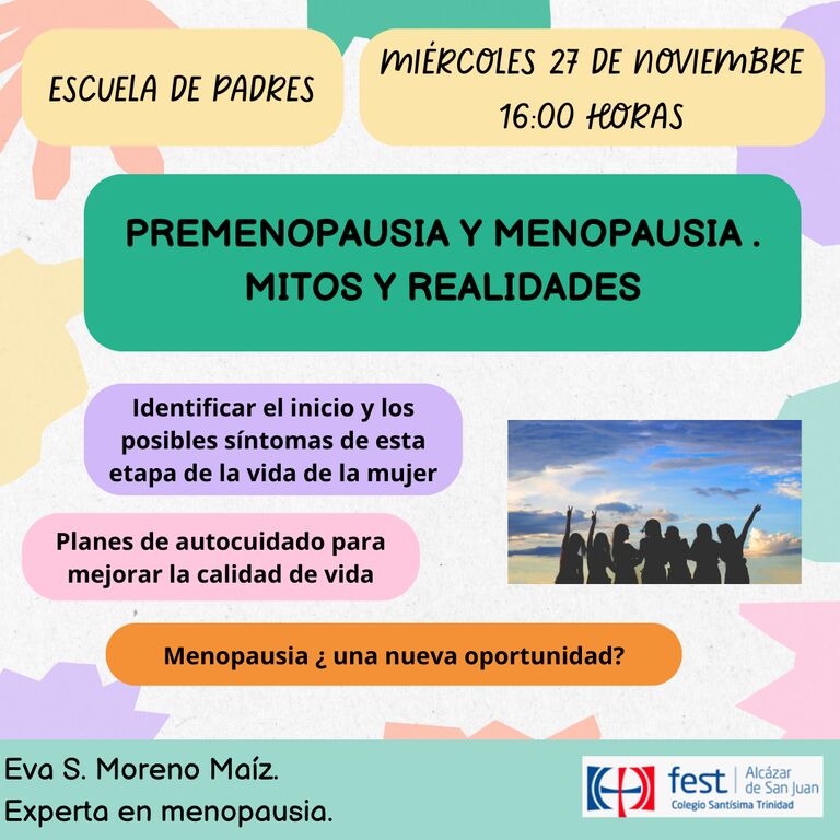 El Colegio Santísima Trinidad de Alcázar de San Juan continúa con la Escuela de Padres, en este caso con un taller impartido por la doctora Eva Moreno, médico de familia experta universitaria en menopausia y miembro de la asociación española para el estudio de la menopausia, que tendrá lugar este miércoles a las 16h en el SUM del colegio.