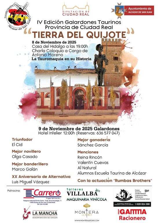 La Escuela Taurina de Alcázar de San Juan, en colaboración con la Diputación de Ciudad Real y el Ayuntamiento de la localidad, ha organizado la IV Edición de los Galardones Taurinos “Tierra del Quijote”, que se celebrará los días 8 y 9 de noviembre de 2025 en la ciudad.