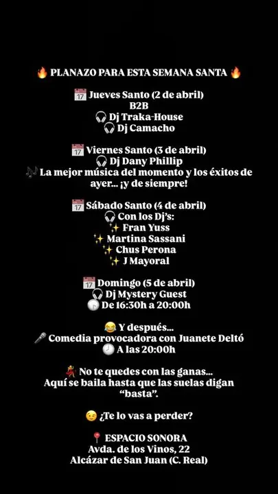 Esta programación busca consolidar a Espacio Sonora como un referente de ocio alternativo en la comarca, ofreciendo una agenda variada durante fechas señaladas como la Semana Santa.