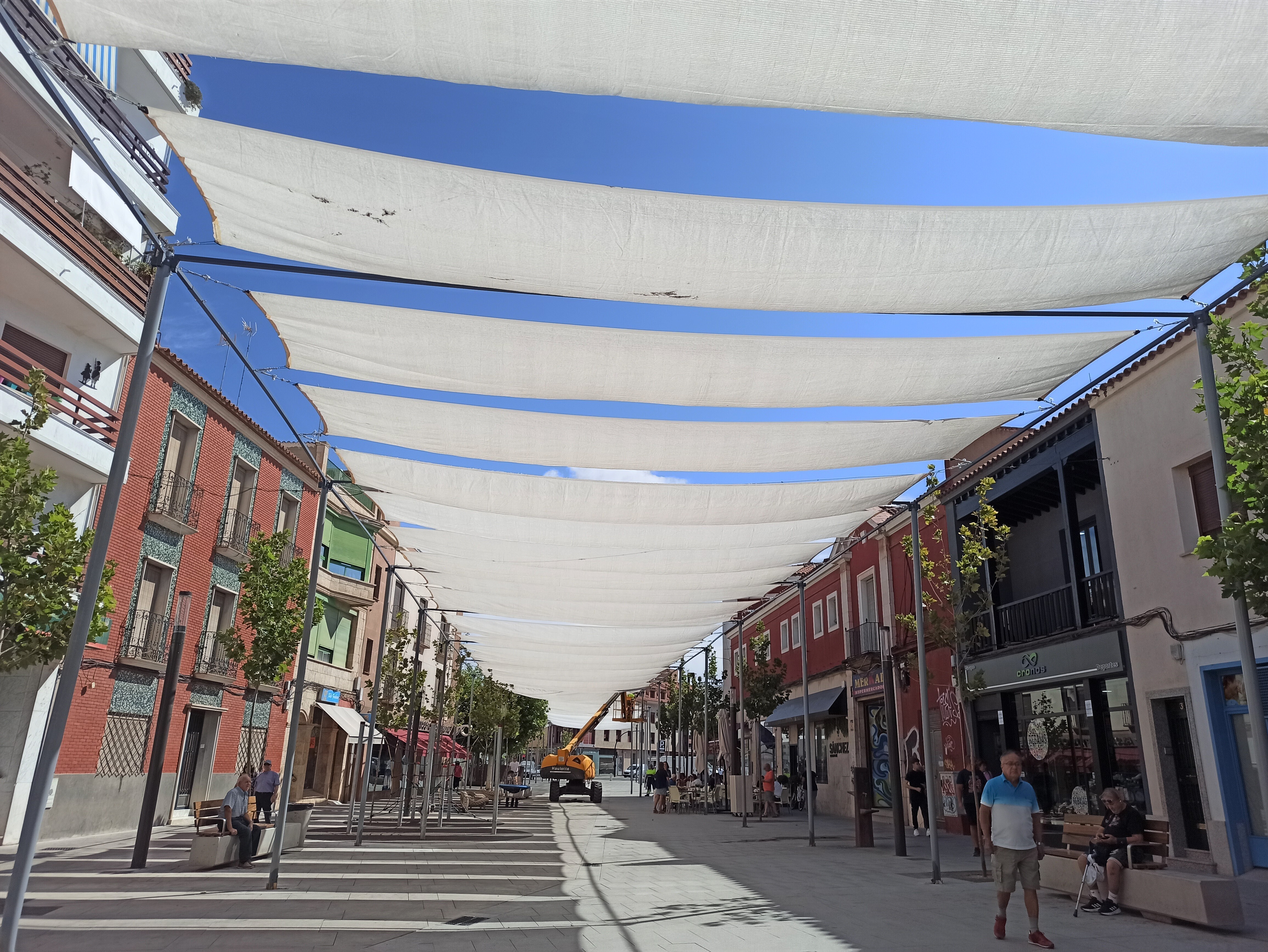 De esta forma, y tras la colocación de unos pilares que ya van a permanecer instalados para el resto del año, se están colgando los toldos que darán sombra a la zona inicial de la calle doctor Bonardell y parte de la Plaza de España, en la zona de la Oficina de Turismo y las esculturas de Don Quijote y Sancho Panza.