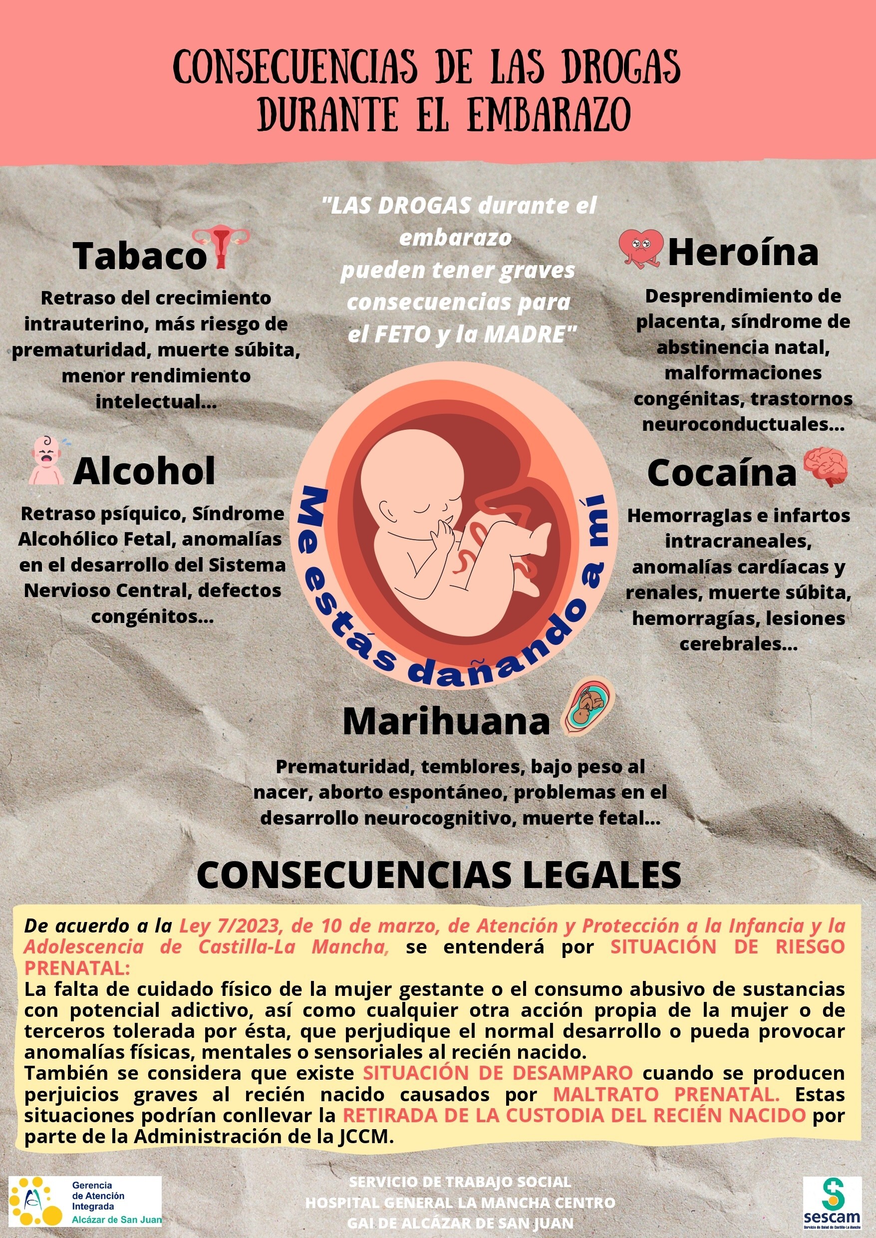 El Servicio de Trabajo Social de la Gerencia de Atención Integrada de Alcázar de San Juan, dependiente del Servicio de Salud de Castilla-La Mancha (SESCAM), ha iniciado una campaña informativa, dirigida a la población en general y específicamente a las mujeres embarazas o que se planteen estarlo, para alertar de los peligros y consecuencias de tomar drogar durante la gestación.