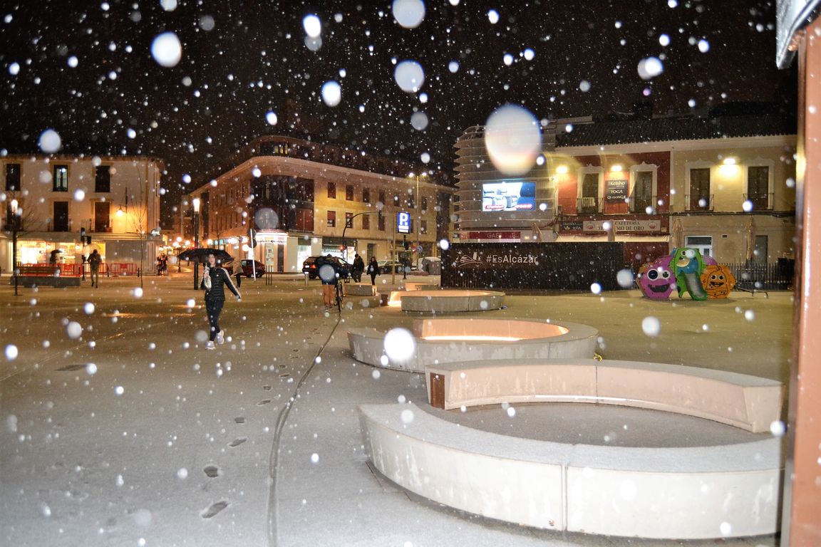 A pesar de que hoy no estaba previsto en el centro de La Mancha, este sábado el granizo y la nieve han hecho acto de presencia en Alcázar de San Juan, donde en torno a las ocho de la tarde ha empezado a granizar con fuerza y después a nevar, dejando bonitas estampas como estas de la plaza de España