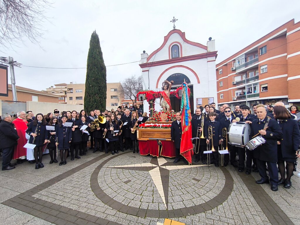 La procesión de San Sebastián de 1895 fue precisamente el primer acto de esta Banda de Música, documentado en las actas del Ayuntamiento. Es por ello que la procesión de este año 2025 ha sido muy especial y así lo han querido reflejar los miembros de la Hermandad con el regalo de esta fotografía conmemorativa.