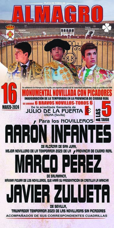 El festejo ha levantado bastante interés entre los aficionados de la provincia. En él estarán presentes, d.m, además del alcazareño Aarón Infantes, el sevillano Javier Zulueta y el salmantino Marcos Pérez, quien a su temprana edad ha levantado todas las expectativas habidas y por haber (incluso lo conceptúan como el nuevo niño prodigio del toreo). Los novillos son de Julio de La Puerta, de Osuna (Sevilla).