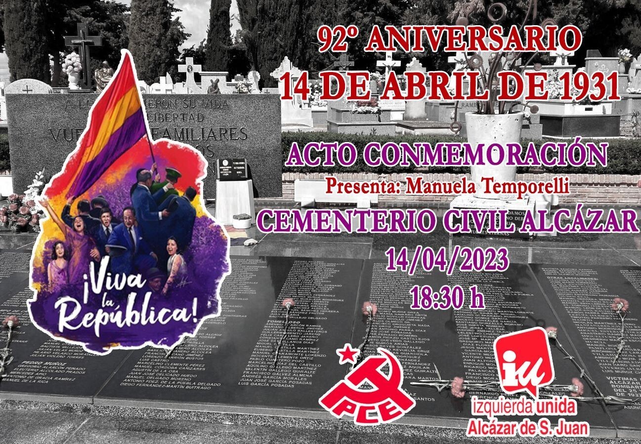 La Asamblea Local de IU Alcázar conmemora este viernes el 92 aniversario de la proclamación de la II República con la celebración de varios actos: una ofrenda floral en el cementerio y una representación teatral